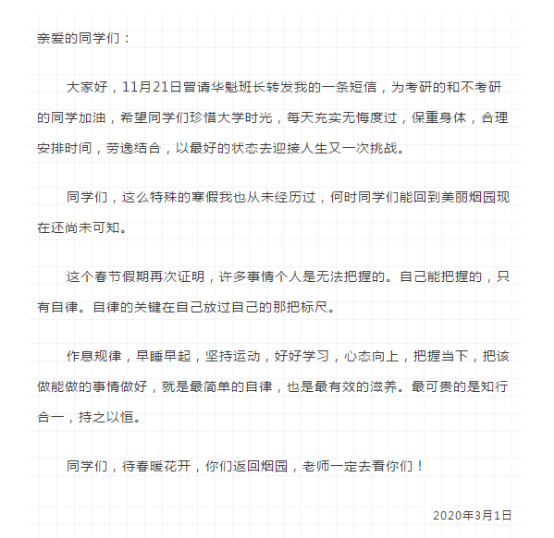 最后,也同样希望,全院的同学,在读过郝董事长满含关怀的信以后,能够有所体会,有所改变,待春暖花开,在美丽烟园,遇见不一样的你。