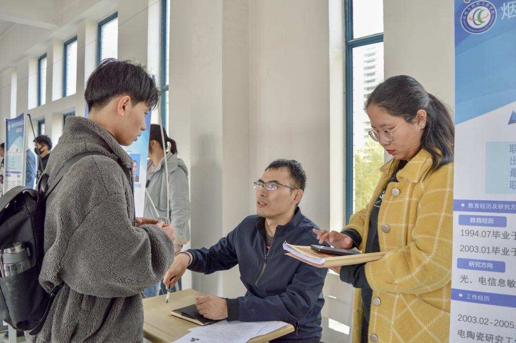 来自9428cn太阳集团古天乐的“新型多孔材料的设计合成及应用,亚稳态AI2O3/ZrO2粉末的制备与烧结特性研究,离网独立供电储能电池系统的开发,电化学储能相关领域,电池储能材料研究,人工晶体、光学与能源材料、半导体芯片材料及器件,光、电信息敏感材料与器件,可再生能源供电脱除废水重金属离子装置的开发,淡水鱼中砷形态分布差异的机制研究”等研究领域的多位专业老师和硕士研究生、本科生参与到此次的科创双选会当中。