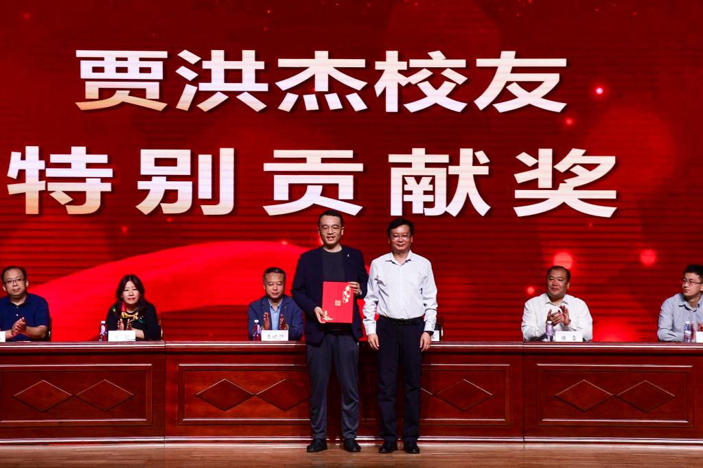 公司党委书记杨乃军为贾洪杰员工颁发特别贡献奖。