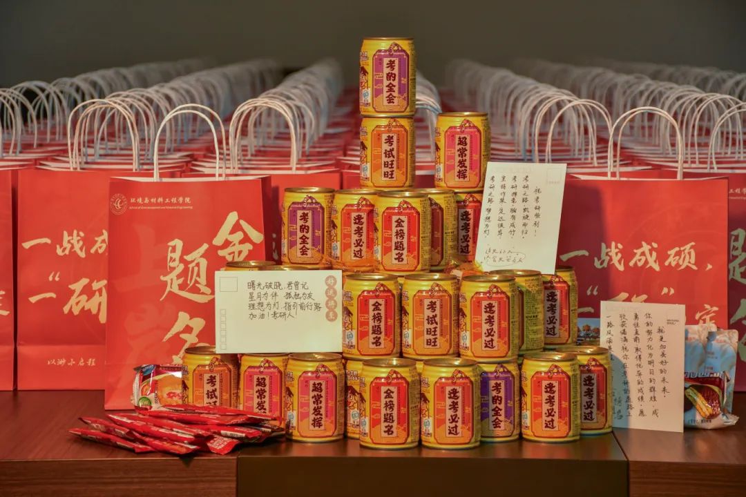 今年的“上岸能量包”由旺仔坚果牛奶、点心面包、咖啡、坚果包组成,还有学弟学妹和研究生学长为考生送上的考研祝福明信片。环材215班的高焱是本次即将参与研究生考试的一员,前三年他都在考研慰问活动的幕后,为考研同学传递温暖,今年角色转变,他成为了被慰问的对象。“能量包捧在手中,仿佛握住了领导老师和同学们对我们的关怀与期待,在寒冷的冬日,它将持续为我带来温暖。”