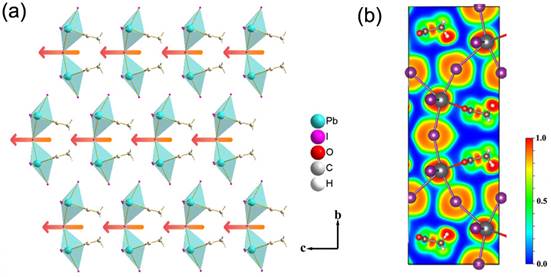 图1. Cs3Pb2(CH3COO)2I5的[PbI4O2]基团和[CH3COO]基团的净偶极矩指向(a);(100)面的电子局域函数图(b)。