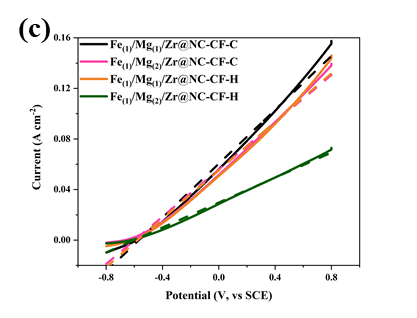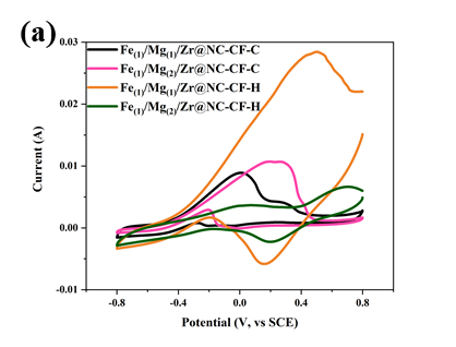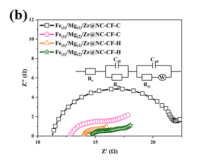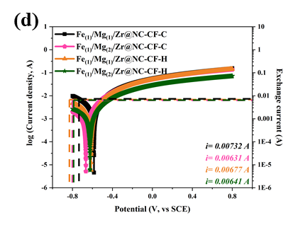 与另外三种催化电极相比,Fe(1)/Mg(1)/Zr@NC-CF-H催化阴极具有明显的还原峰、更低的总电阻以及较高的交换电流密度和Tafel斜率。CV、EIS、LSV和Tafel曲线的分析结果表明,Fe(1)/Mg(1)/Zr@NC-CF-H催化电极具有优异的点催化性能,这体现在更快的电化学反应率和电子转移效率。