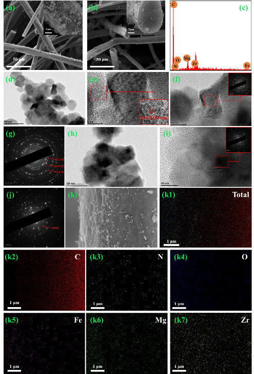 图2. Fe(1)/Mg(1)/Zr@NC-CF-H催化电极的(a-b) SEM图像,(c) EDS图像,(d-j) TEM图像(g和j显示相应的SAED图像)和(k)元素图。