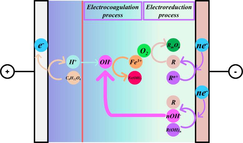放射性离子是通过电还原和电絮凝的联合作用去除(图4)。电还原是去除放射性离子的主要机制。首先,电子通过阳极微生物的代谢过程产生并释放到阳极液中,然后通过外电路转移到阴极表面。最后,通过阴极液中的放射性离子作为电子受体获得电子,进行还原反应。此外,电絮凝在放射性离子的还原中也发挥了一定的作用。铁阳极氧化产生的三价铁离子与氢氧根离子结合形成具有较好絮凝性能的氢氧化铁,可络合放射性离子。