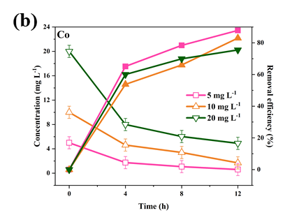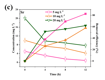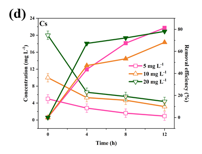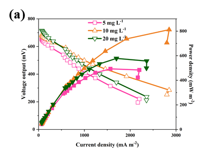 随着初始离子浓度的增加(从5 mg L -1至20 mg L-1),最大功率密度先增大后减小,这可以用Nernst方程来解释(图3a)。如图3b-f 所示,Co(Ⅱ)、Sr(Ⅱ)和Cs(Ⅰ)在5 mg L-1时具有最大去除效率(< 90 %),而其他两种离子在浓度为10 mg L-1时具有最大去除效率(> 95 %)。与其余三种放射性离子相比,La(Ⅲ)和Ce(Ⅲ)具有较高的氧化还原电位,很容易被还原。
