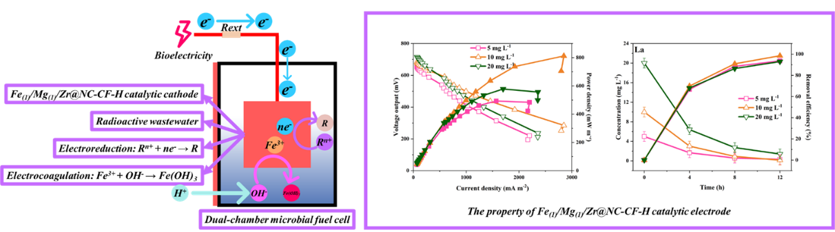 近年来,核工业废水的处理备受关注。但由于传统处理方法能耗高、去除效率低,不适合核工业废水的处理。在此,我们构建了具有碳毡基铁/镁/锆多晶催化阴极的双室微生物燃料电池(MFC),以去除低浓度核工业废水中的放射性离子。在阳极表面形成生物膜后,记录到0.8 V的稳定电压输出,双室微生物燃料电池在pH 2的阴极电解液中获得了1.4 W m-2的最大功率密度,优于Pt/C阴极。此外,双室微生物燃料电池对放射性离子的去除效率超过80 %,在离子浓度为5 mg L-1时对镧和铈的去除效率超过98 %。这种被称为微生物燃料电池的低成本、高性能生物电化学系统(BES)为利用产电去除核工业废水中的放射性离子打开了新的探索之门。
