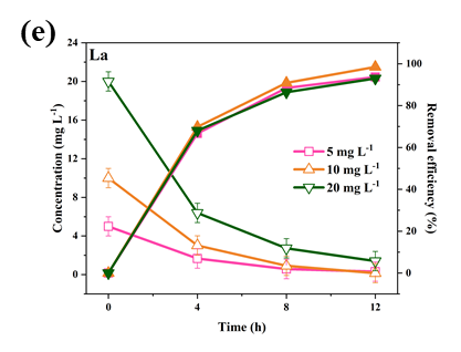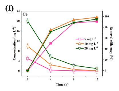 图3. 不同初始浓度(5、10、20 mg L-1)对(a)功率输出以及不同放射性离子的还原效率的影响:(b)钴(Ⅱ),(c)锶(Ⅱ),(d)铯(Ⅰ),(e)镧(Ⅲ),(f)铈(Ⅲ)。