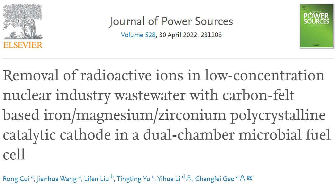 近日,公司高常飞副教授团队在学术期刊Journal of Power Sources发表了题为“Removal of radioactive ions in low-concentration nuclear industry wastewater with carbon-felt based Iron/Magnesium/Zirconium polycrystalline catalytic cathode in a dual-chamber microbial fuel cell”的研究论文。本研究以壳聚糖为前体,通过水热法制备出铁/镁/锆多晶催化阴极,应用于微生物燃料电池,展现出对放射性离子优异的去除性能。本研究不仅为微生物燃料电池提供了一种新型电催化阴极,而且在实际的废水资源处理和回收中具有潜在的应用前景。