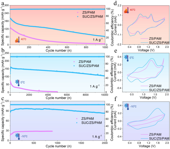 在1 A g-1的电流密度下评估了Zn-VO2全电池在不同温度下的长期稳定性。采用SUC/ZS/PAM水凝胶电解质的Zn-VO2全电池在−10 °C、0 °C 和40 °C的环境温度下表现出更高、更稳定的比容量和稳定的库仑效率。电池在不同温度下显著的循环稳定性表明SUC/ZS/PAM水凝胶电解质具有积极作用,这应该与水凝胶电解质网络内水分活度的减少和HBs网络的重建有关。