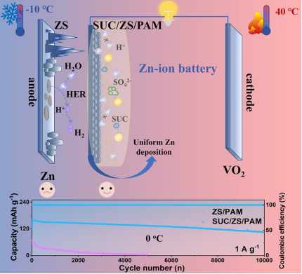 本研究制备了低成本的SUC/ZS/PAM水凝胶电解质,从而使AZIBs能够在宽温度范围内工作。PAM和SUC的协同作用促进了Zn2+的均匀沉积,建立了先进的离子传输机制,平衡了水分子的活性和Zn2+的动力学,显著提高了锌负极的稳定性。基于以上优势,锌负极表现出优异的电化学稳定性。Zn//Cu电池的CE高达99.07%,Zn//Zn对称电池在0.5 mA cm−2/0.5 mAh cm−2电流密度/截止面容量的条件下,具有超过6240小时的稳定循环。SUC/ZS/PAM电解质也具有宽温域范围内的应用。对称电池能在下以表现出超过3970小时的稳定循环。在时,Zn//VO2全电池能够在−10 ℃至40 ℃温度范围内稳定循环1000次。添加SUC的PAM水凝胶电解质具有优异的稳定性,能够抑制锌负极上副反应的发生,并且实现宽温域下的优异电化学性能。