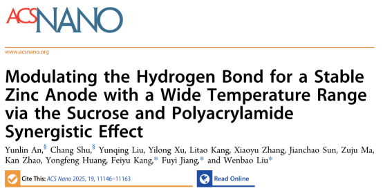 近日,公司姜付义教授团队在学术期刊ACS Nano发表了题为“Modulating Hydrogen Bond for Stable Zinc Anode with Wide Temperature Range via Sucrose and Polyacrylamide Synergistic Effect”的研究论文。本研究提出了一种协同策略,通过向聚丙烯酰胺(PAM)水凝胶电解质中添加电解质添加剂蔗糖(SUC)来提高锌负极的稳定性。制备的水凝胶电解质具有优异的稳定性和安全性,能够抑制锌负极上副反应的发生,并且实现宽温域下的优异电化学性能。这个工作为实现宽温度适应性和长循环稳定性的水系锌离子电池提供了思路。
