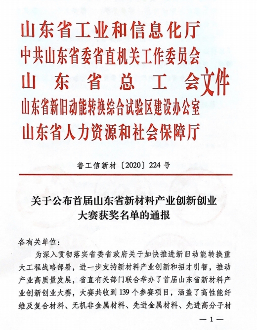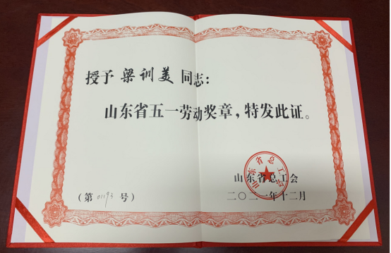 近日,从山东省总工会传来喜讯,首届山东省新材料产业创新创业大赛企业组第一名获奖选手梁训美,被评为“山东省五一劳动奖章”获得者。